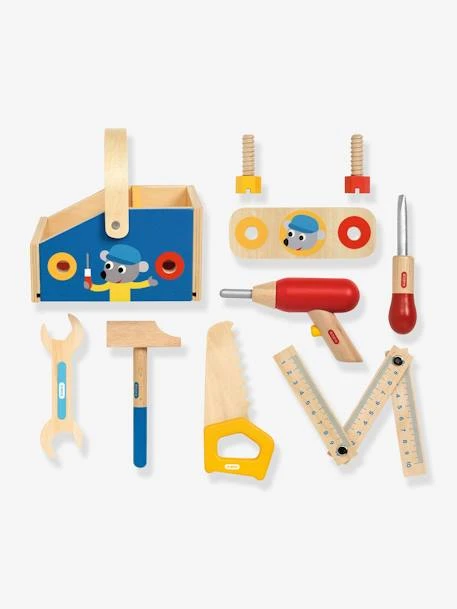 • Contenu : 6 outils (1 perceuse, 1 tournevis, 1 clef à molette, 1 scie, 1 marteau, 1 mètre qui s’articule), 1 boite à outils avec 2 compartiments et 1 solide poignée, 1 pièce en bois trouée,  2 grosses vis.