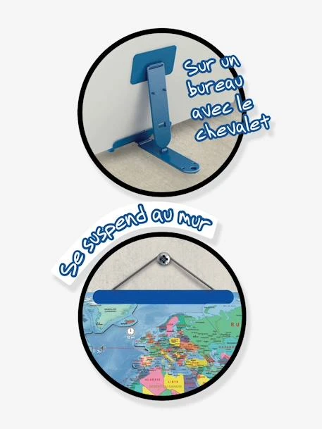 Un planisphère de 70 x 38 cm pour découvrir les pays du monde. La carte peut s’accrocher au mur ou se poser sur le bureau grâce à son système de chevalet.