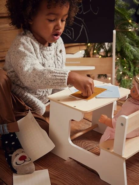 Du mobilier de classe pour jouer à la maîtresse avec ses poupées ! Un set complet avec tableau, pupitre, cahiers d’exercices, emploi du temps et bulletin de notes que votre enfant pourra noter grâce aux planches de stickers avec pastilles colorées (bleu pour très bien, rose pour bien, noir pour moins bien).